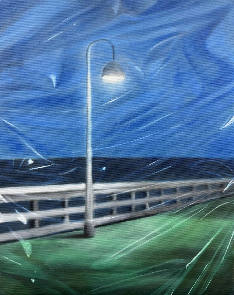 Angela Wichmann erforscht mit dieser Werkreihe malerisch das Sichtbare mit dem Unsichtbaren. Dabei ist die Überlappung von beiden zentral für das räumliche Geschehen. In einem Dialog mit Materialität, spielt die Malerin mit dem Gegensätzlichen von Vorder- und Hintergrund. Die transparente, nahezu greifbare Folie fungiert als ambivalente Membran: Sie verspricht Schutz und erzeugt zugleich Verunsicherung, indem sie Wahrnehmung verschiebt und verdeckt. Der Hintergrund steht in Spannung zu dieser Barriere und destabilisieren vertraute Raumvorstellungen. Wahrnehmung wird hier nicht bestätigt, sondern infrage gestellt – ein visuelles Feld, in dem Gewissheiten brüchig werden und sich Bedeutung ständig neu formiert.